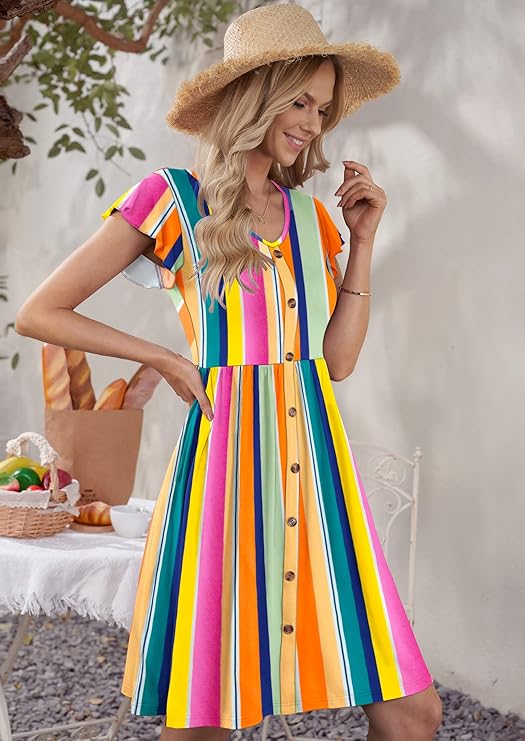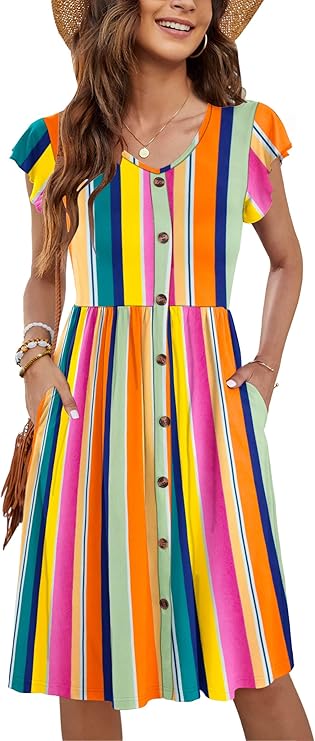 • Fashion-simple design:Swing Flowy dress,Sexy V Neck,Elastic Waist,Midi Length,a line summer dress features Ruffle Sleeve and decoration buttons,The softly gathered waistline creates natural pleating let you look more slender and can Hide Your Bumps Area Well,sleeveless style is very trendy and cool in summer, it is easy to care on daily life or travel